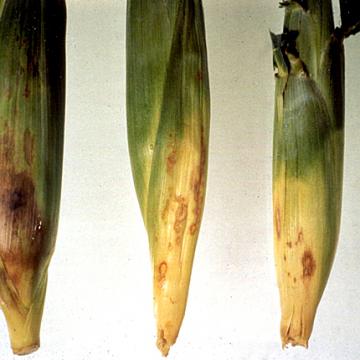 Corn husk leaves with brownish red streaks and blotches. The leaves turn brown but may later become gray or white. Symptoms vary depending upon genotype.